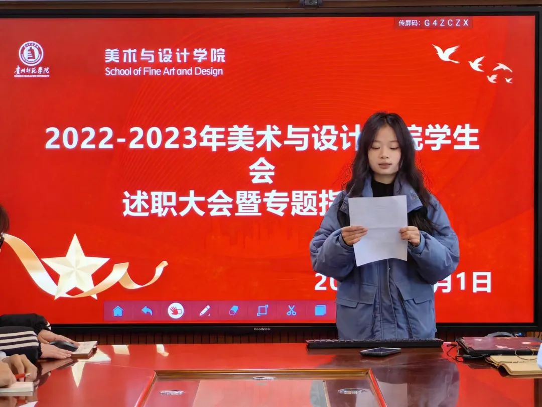 按照会议流程,各部门负责人依次进行述职。首先,员工会主席团成员马宁对本学期员工会的整体工作进行总结,紧接着,各部门部长进行述职报告,总结本学期的工作成果和经验教训,并结合实际工作情况,提出下一步工作目标,在复盘中进行思考和总结。随后,黄婧对员工会的工作进行点评和指导,她对同学们一年的辛勤工作表示了感谢,勉励同学们在成绩中积累经验,在挫折中吸取教训,勇毅笃行,长风万里,争取未来更上一层楼。