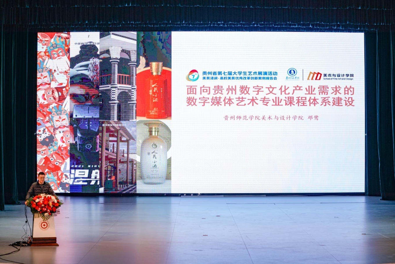 邓鹭老师分享的案例是关于面向贵州数字文化产业需求的数字媒体艺术专业课程体系建设,他介绍了数字媒体艺术专业依托联合贵安新区超算中心、贵州数字文化产业联合会、绥阳县人民政府、贵州笑果科技有限公司、岩博酒业人民小酒品牌等多业态数字文化产业需求资源,创新地建立以贵州数字文化产业需求为主题的系统课程,打通《MG动画》《数字角色人物创作》《数字特效表现》等课程板块,打造研发面向贵州数字文化产业视听技术需求、文化传播需求、元宇宙建设需求的课题体系,并建设了一支数字媒体艺术的团队队伍。