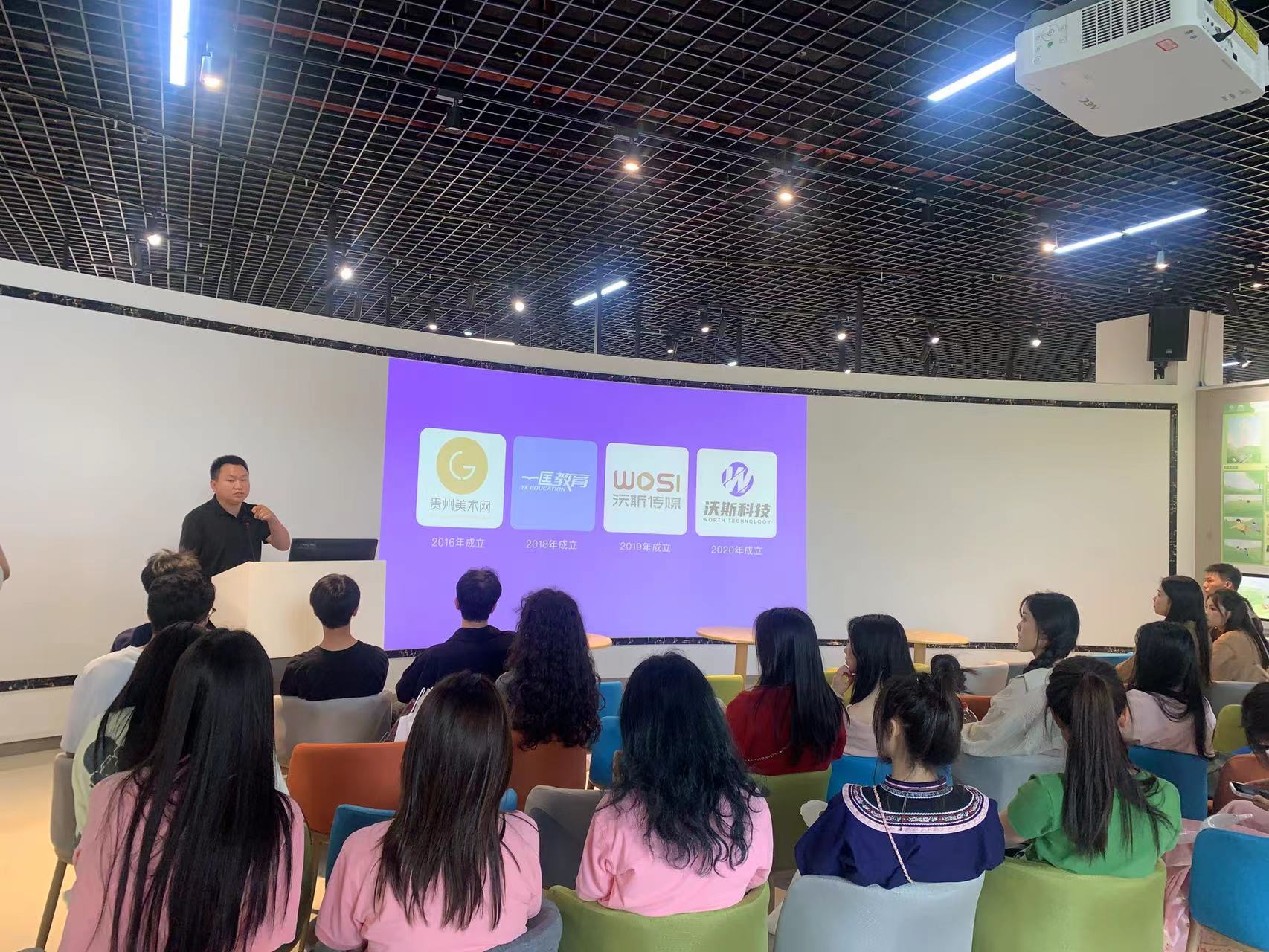 在宣讲中,徐进先生向同学们介绍了贵州沃斯传媒有限公司的发展历程、公司业务以及招聘岗位。贵州沃斯传媒有限公司成立于2016年,主营业务有短视频运营、视频拍摄、电商直播、音乐节、演唱会及各类活动策划与执行等等。公司目前的短视频运营、新媒体运营、活动执行、带货主播等岗位在火热招聘中。公司投资的项目还有“贵州美术网”“一匡教育”“沃斯科技”也面向2024届优秀毕业生提供众多就业岗位。其中贵州美术网是贵州目前流量和关注度最大的艺术类资讯平台,主营业务有网络推广、品牌宣传、志愿填报、写生服务、教师培训、模拟考试、艺术留学等项目,热招岗位主要有社群运营、网络编辑、新媒体运营、平面设计师等。