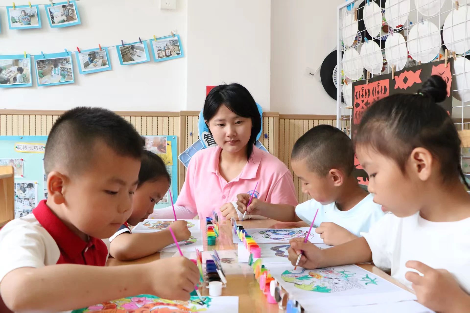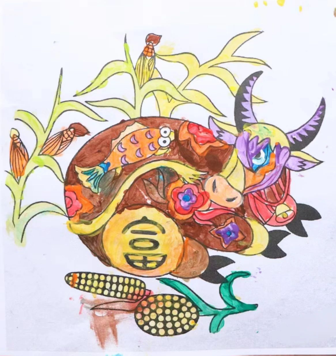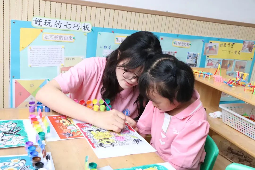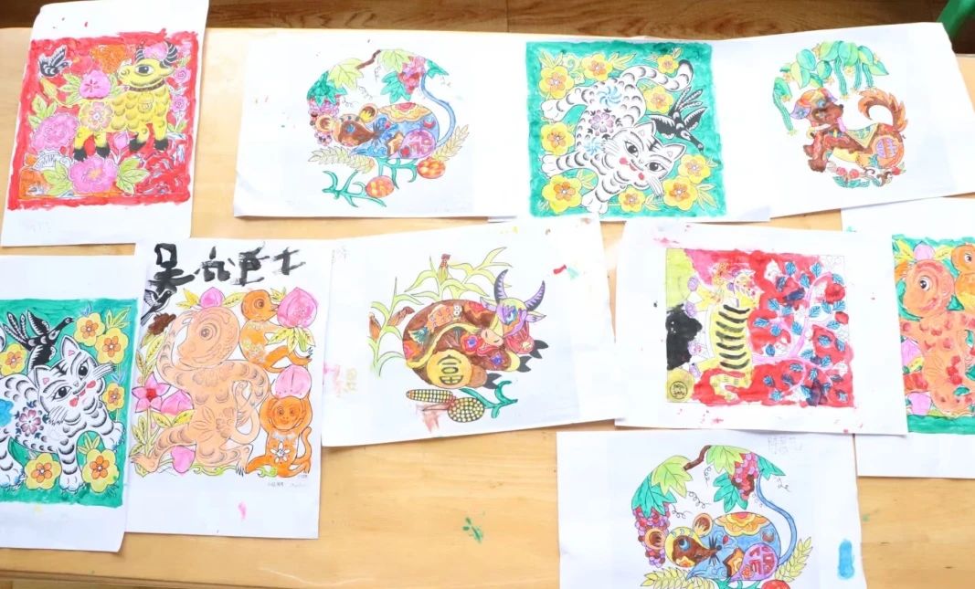 理论浸润心灵,实践激发创造。在孩子们对农民画有了初步感知后,冯慧与团队成员用心指导,带领小朋友们执起画笔,亲身体验创作的乐趣。他们鼓励孩子们从熟悉的乡村景物、家中的小动物、田间的劳作场景或天马行空的想象中汲取灵感,大胆运用农民画标志性的鲜艳色彩和夸张造型进行表达。一时间,画纸上跃动着童真的线条与斑斓的色块,质朴的生活之美在孩子们的笔尖流淌、绽放。团队成员细致耐心的陪伴与启发,让整个创作过程洋溢着欢乐与发现的惊喜。