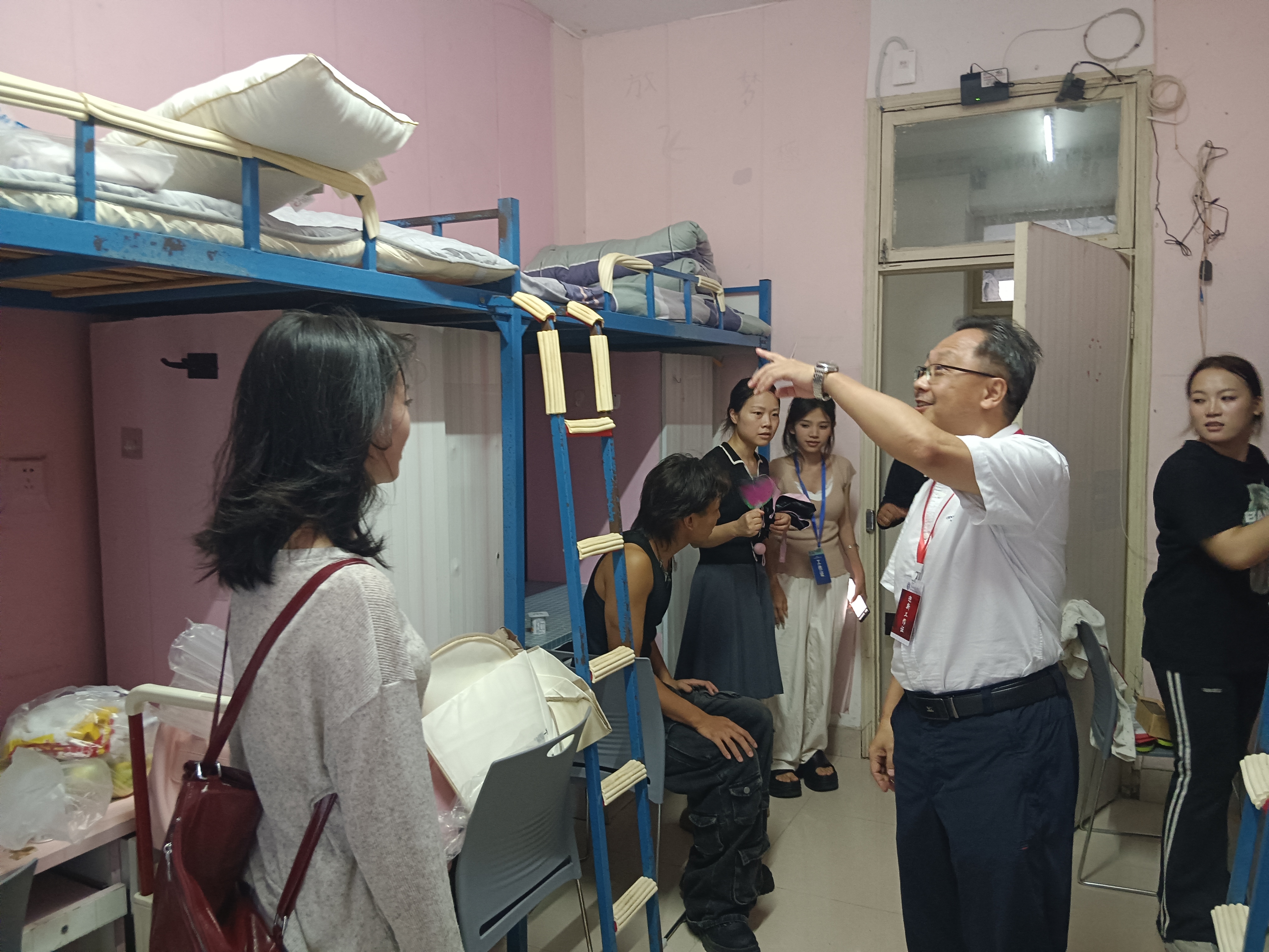 为全面了解新生入学后的适应情况,关心员工生活与成长,9月4日下午迎新工作结束后,美术与公司领导班子深入2025级新生寝室开展走访慰问。经理聂森、党委书记郝进欣等公司领导班子成员、公司辅导员、团委老师和员工干部一同参加。